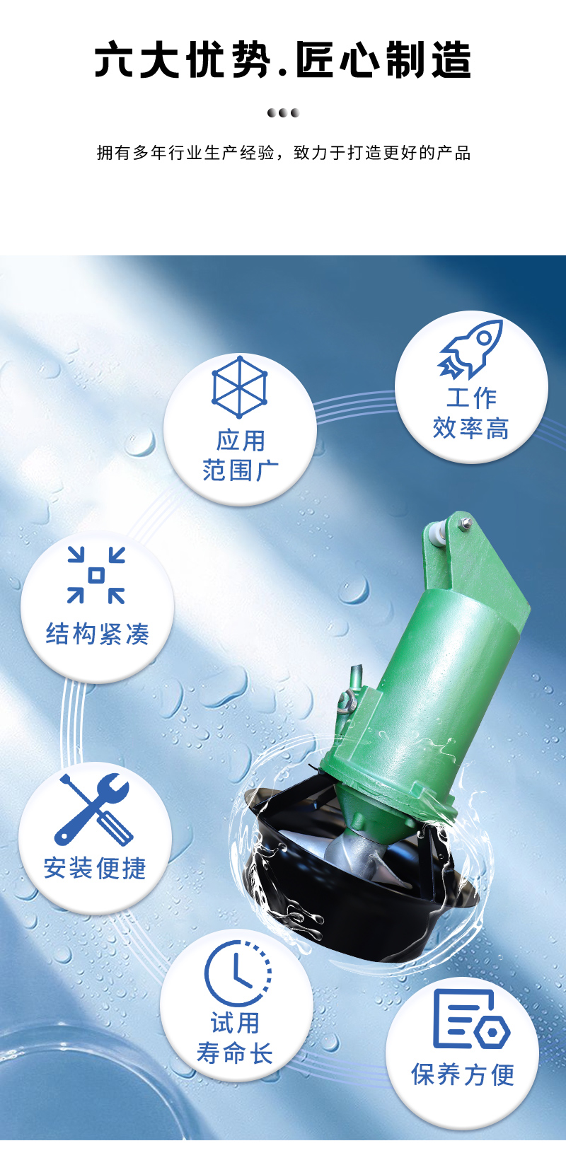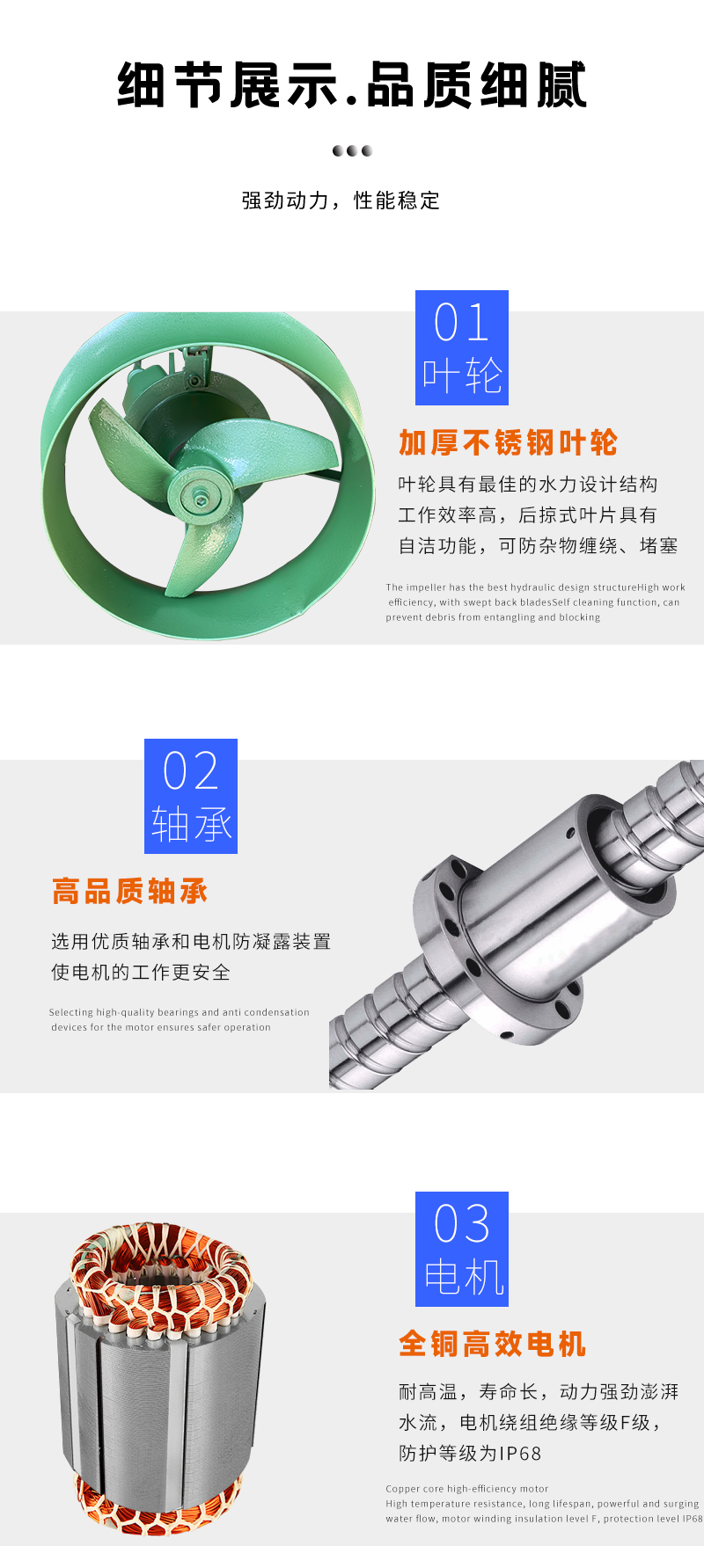 葉輪具有很好的水力設(shè)計(jì)結(jié)構(gòu),工作效率高,后掠式葉片具有自潔功能,可防雜物纏繞、堵塞; 電機(jī)繞組絕緣等級(jí)F級(jí),防護(hù)等級(jí)IP68,選用NSK軸承和電機(jī)防凝露裝置,使電機(jī)的工作安全;